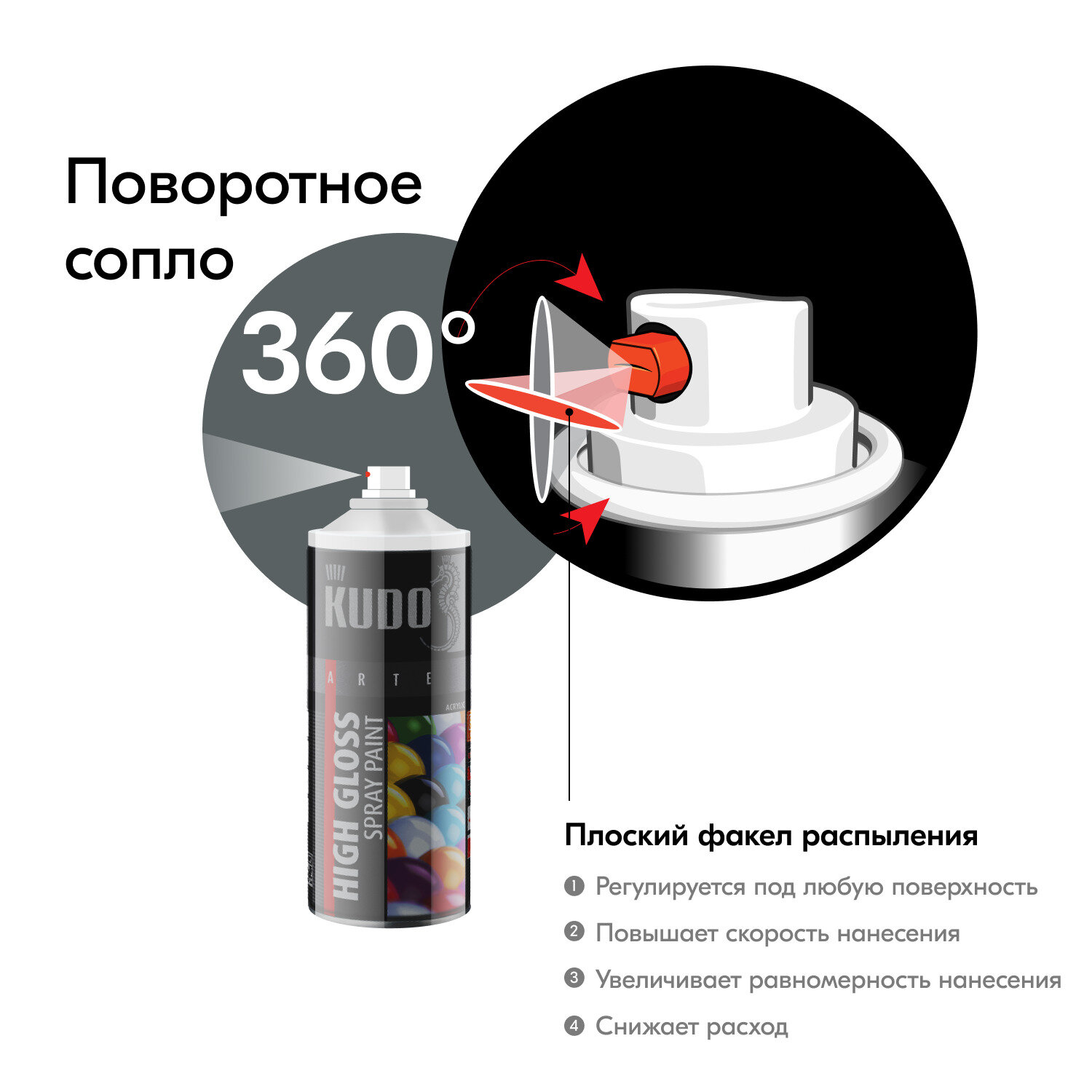 Аэрозольная акриловая краска Kudo KU-A9005, глянцевая, 520 мл, черная