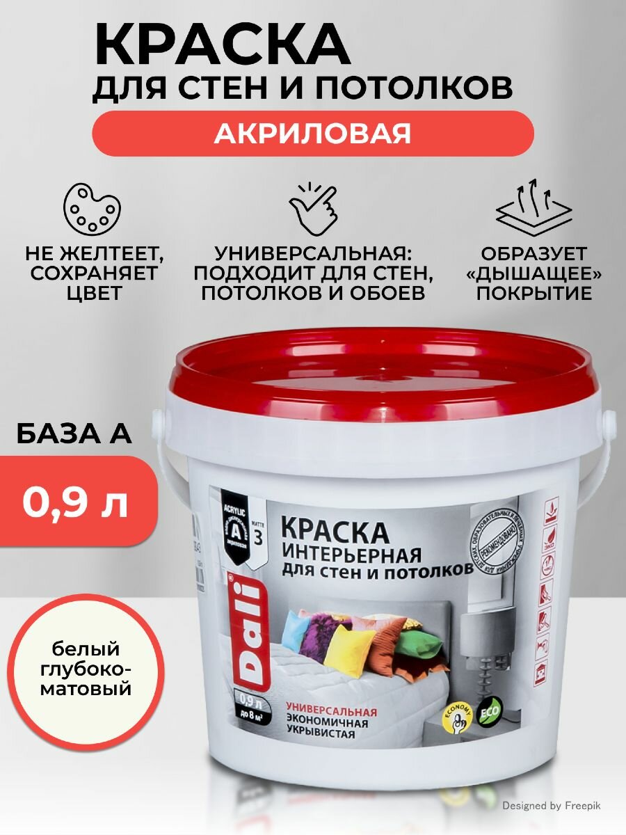 Краска интерьерная Dali, акриловая, глубокоматовая, база A, белая, 0,9 л