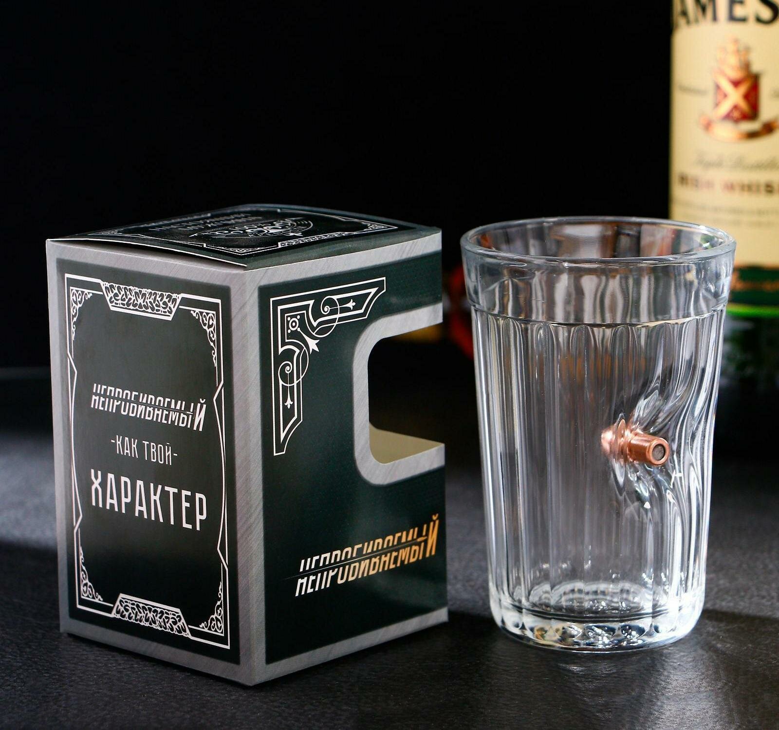 Стакан подарочный, бокал с пулей для пива "Непробиваемый Характер" граненый, 250 мл