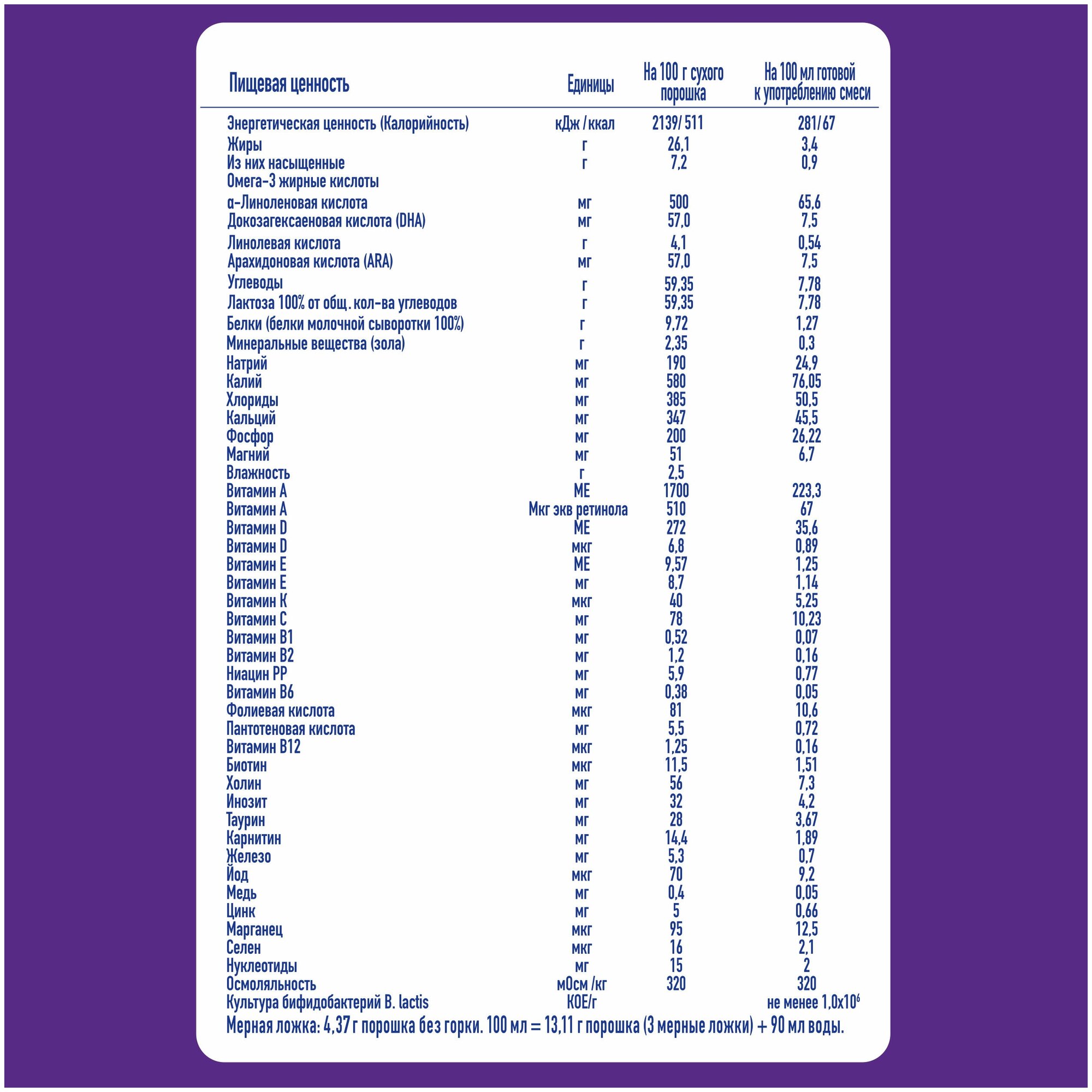 | Отзыв: | У меня практически нет своего молока и практически с рождения оба ребёнка на смеси. Кормлю обоих смесью NAN. Никогда не было ни запоров, ни прыщей, ни коликов (тьфу, тьфу, тьфу) удобно рпзмешивается. В комплекте со смесью мерная ложечка. Рпзмешивается в тёплой водичке. 1 ложка на 30 мл смеси. Единственное, что не нравится - цена(( покупаем большую упаковку 800 гр, стоит 1100 и хватает на неделю. А учитывая, что пьём практически рождения, то достаточно накладно выходит (( |
