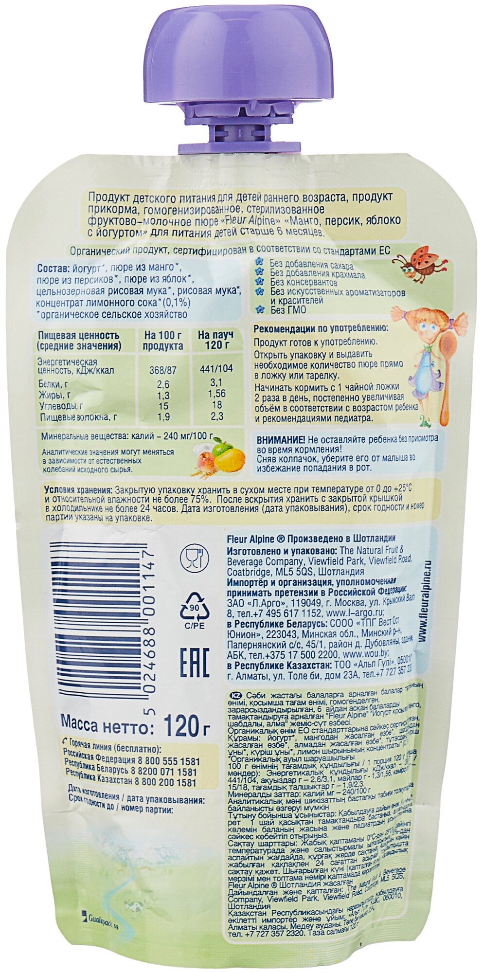 Пюре Fleur Alpine Organic (Флёр Альпин Органик) Йогурт Манго Персик и Яблоко с 6 мес 120 г (пауч) (6 штук в упаковке)