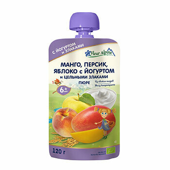 Пюре детское Fleur Alpine манго, персик, яблоко с йогуртом и цельными злаками, с 6 месяцев, 120 г (6 штук)
