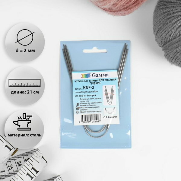 Спицы для вязания GAMMA гибкие, чулочные, металлические, d2,5мм, 21см, 3шт, 1шт