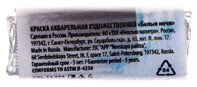 Акварель художественная «Белые ночи», 2.5 мл, белила цинковые, в кюветеВ наборе1шт