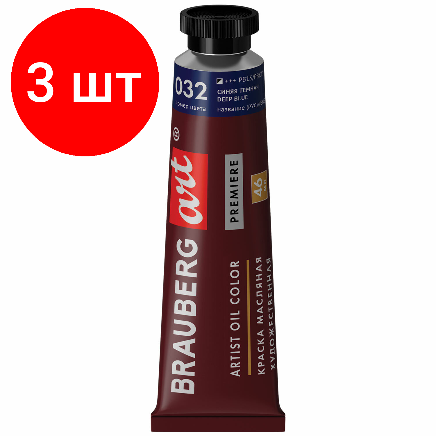 Упаковка 3 шт. Краска масляная художественная BRAUBERG ART PREMIERE, 46 мл, проф. серия, ультрамарин, 191416
