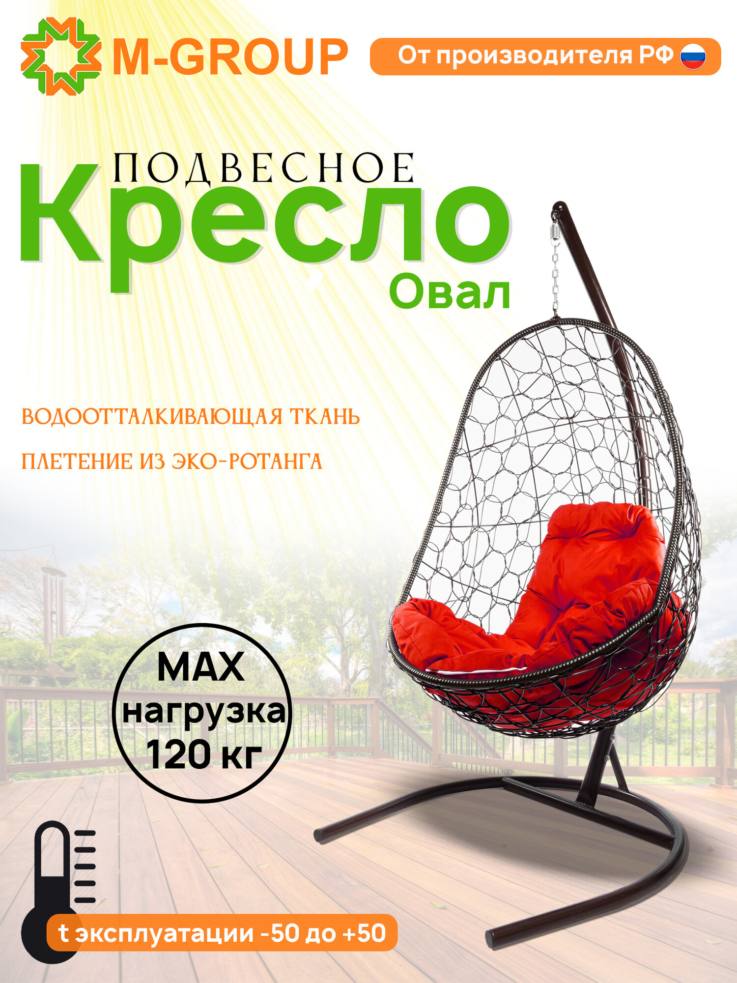 Купить Подвесное кресло M-group овал с ротангом коричневое красная подушка