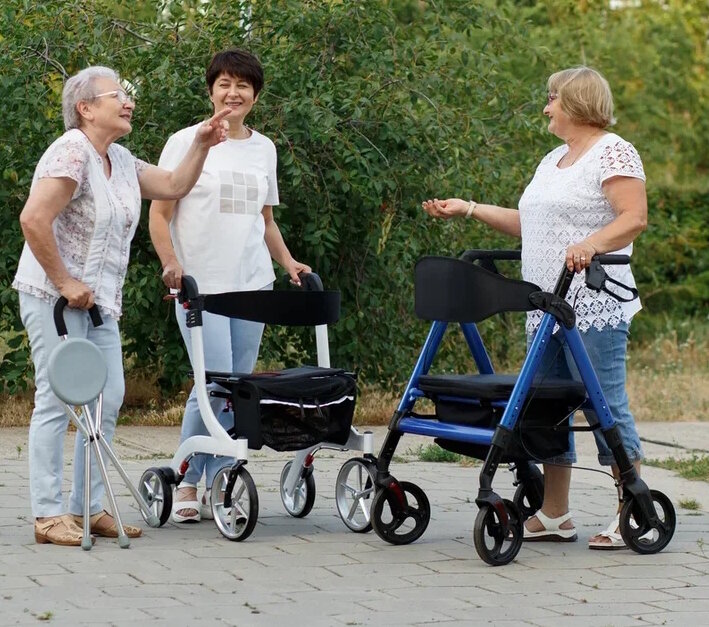 Ходунки-роллаторы для пожилых и инвалидов 4 колеса складные регулируемые по высоте алюминиевая рама до 110 кг Ortonica XR 104 коричневые