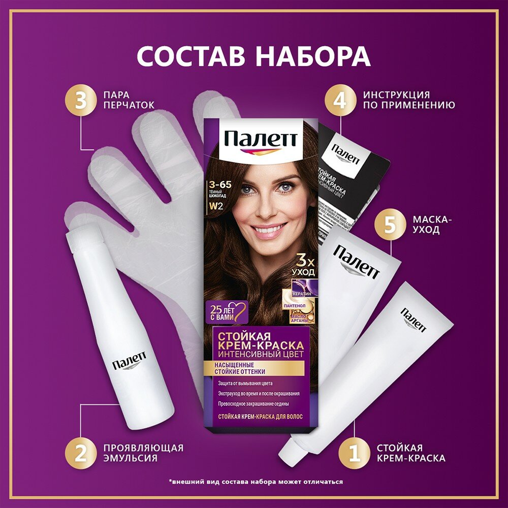 Палетт Стойкая крем-краска Интенсивный цвет, W2 3-65 Темный шоколад, 110 мл - 3 шт