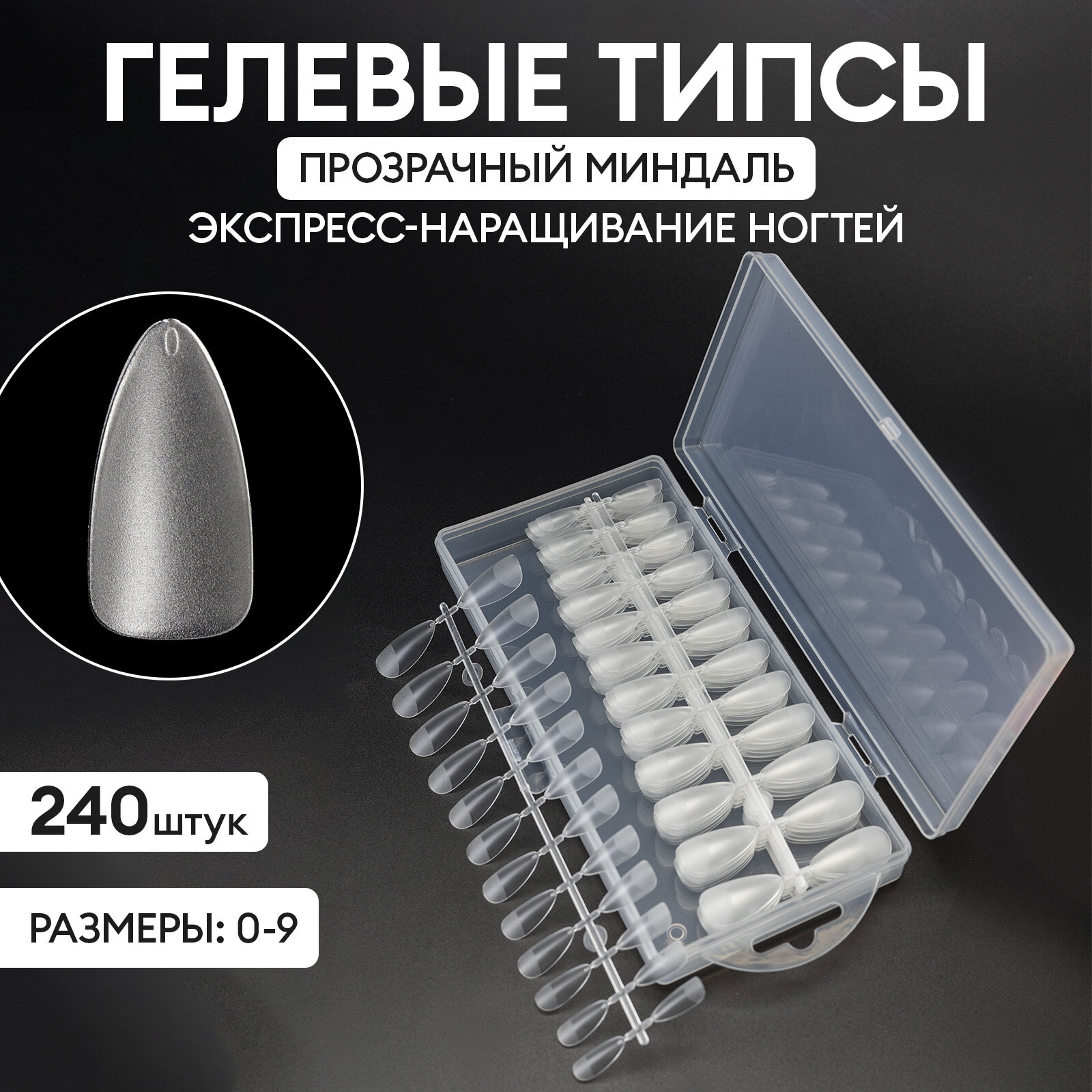 Гелевые типсы для экспресс наращивания прозрачный овал (размеры 0-9), 240 шт. №7371