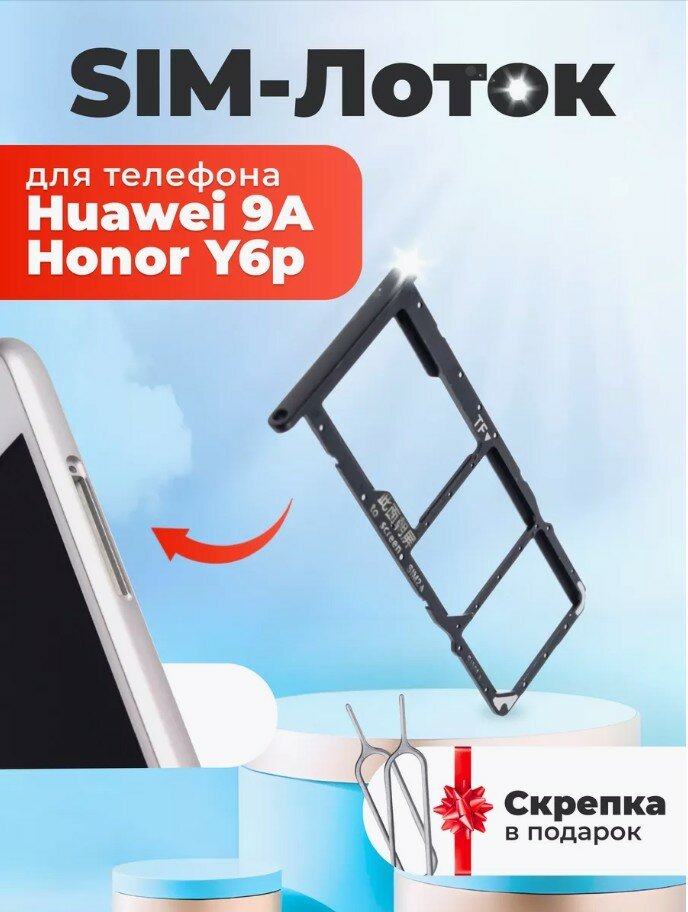 Сим лоток / Держатель сим карты / Контейнер SIM / sim holder для Huawei Honor 9A/Y6p черный, скрепка в подарок интересное: