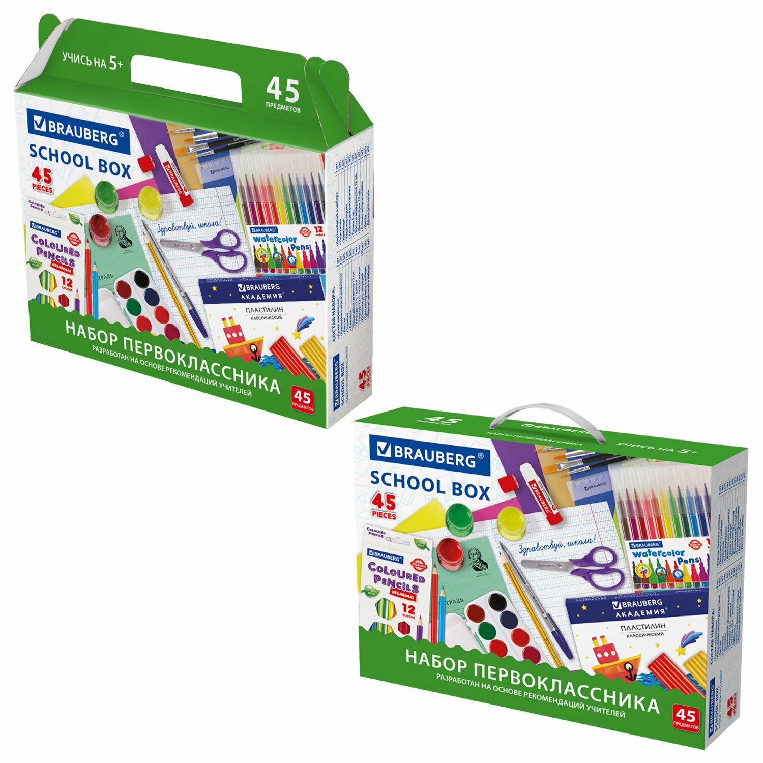 | В комплекте | ручка шариковая синяя — 5 шт, ручка шариковая зеленая, ручка шариковая черная, ручка шариковая красная, карандаш чернографитный – 4 шт, ластик, точилка, карандаши цветные 12 цветов, тетради в клетку 12 л. — 5 шт, тетради в линейку 12 л. — 5 шт, обложки для тетрадей — 10 шт, цветная бумага 10 цветов, картон цветной 12 цветов, картон белый 8 л, ножницы, клей-карандаш, альбом для рисования 20 л, краски акварельные 12 цветов, фломастеры 12 цветов — 1 шт, папка-конверт, А5 — 1 шт, набор чертежный, набор кистей из 3 шт, стакан-непроливайка, блокнот 60 л, закладки клейкие 5 цветов, циркуль, короб подарочный |