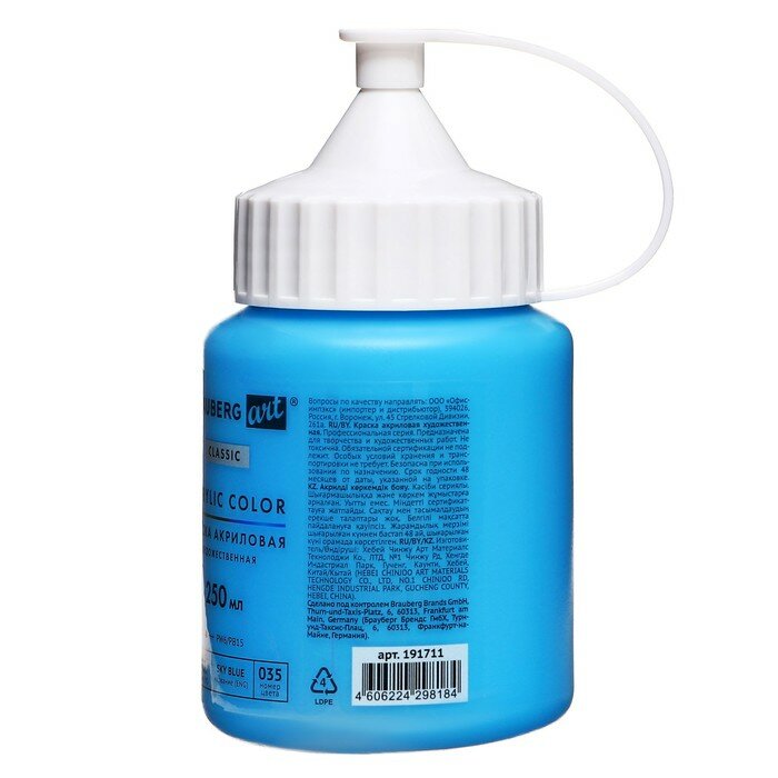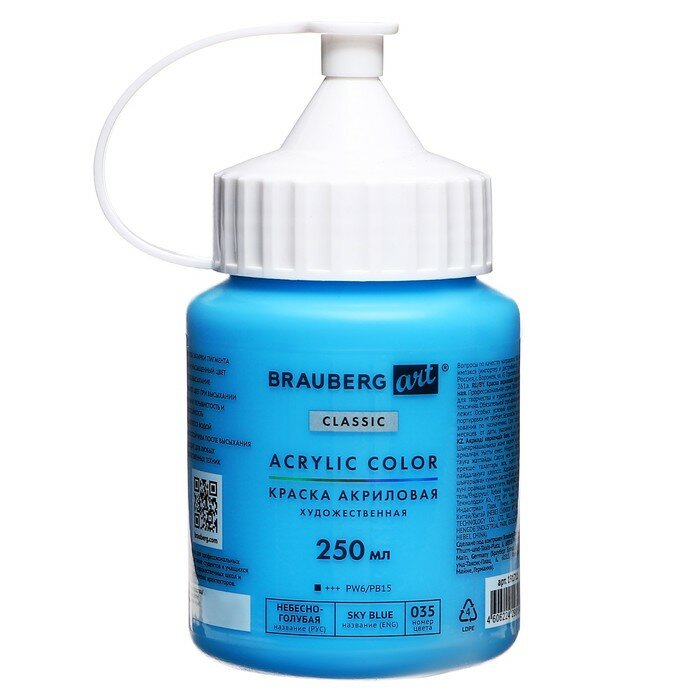 Краска акриловая художественная Brauberg Art Classic, флакон 250 мл, Небесно-голубая, 191711