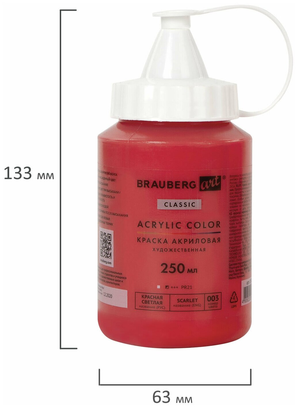 Краска акриловая художественная Brauberg Art Classic, флакон 250 мл, Красная Светлая, 191707