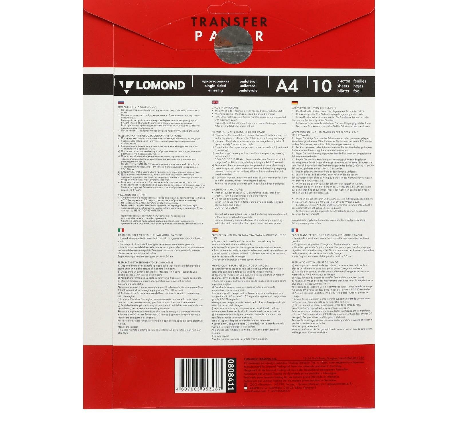 Бумага термотрансферная для светлых тканей, струйная печать, A4, 10 листов, Lomond 0808411