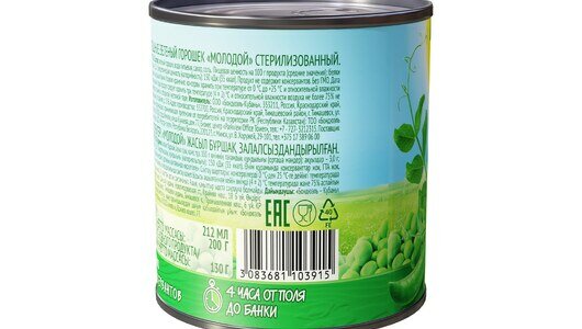 | Состав | зеленый горошек, вода питьевая, сахар, соль |