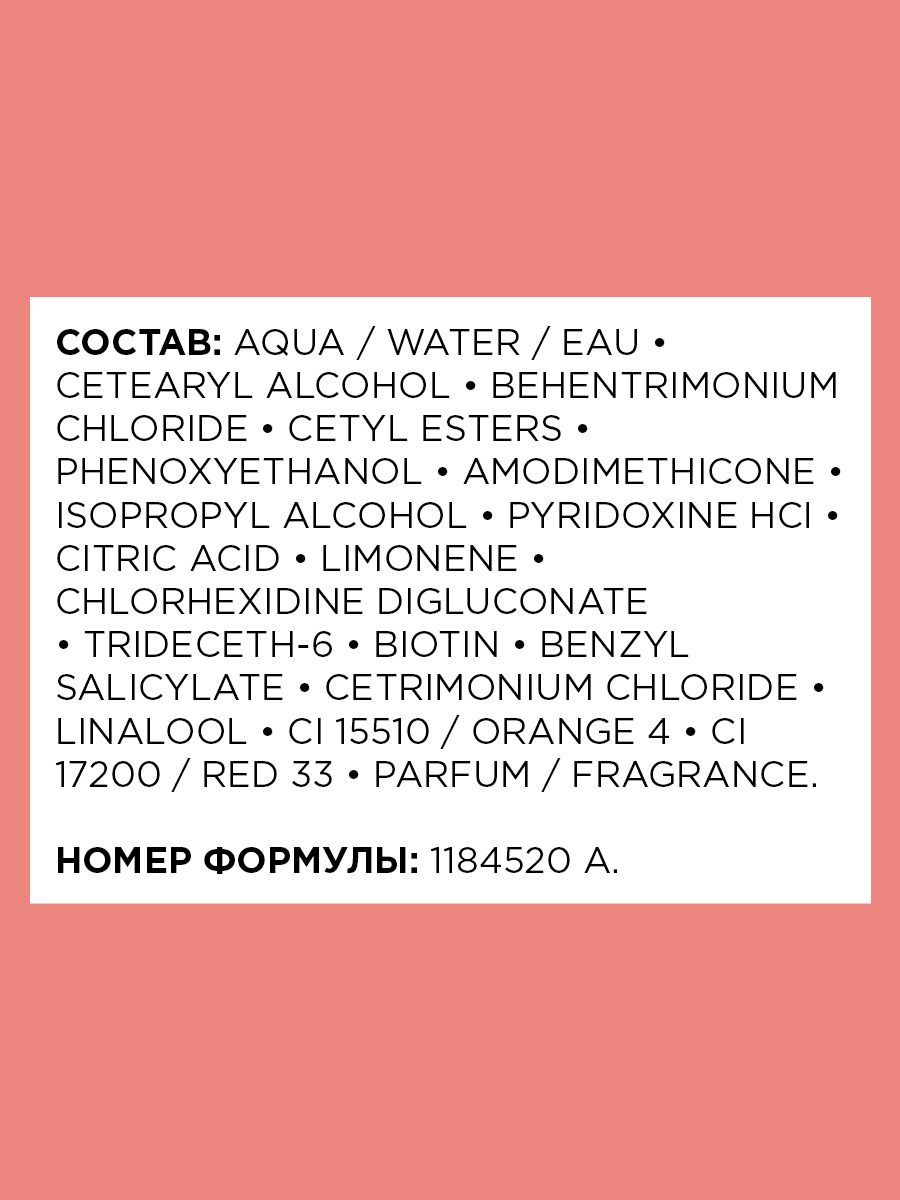 | Состав | aqua / water, cetearyl alcohol, behentrimonium chloride, cetyl esters, phenoxyethanol, amodimethicone, isopropyl alcohol, pyridoxine hcl, citric acid, limonene, chlorhexidine digluconate, trideceth-6, biotin, benzyl salicylate, cetrimonium chloride, linalool, ci 15510 / orange 4, ci 17200 / red 33, parfum / fragrance |