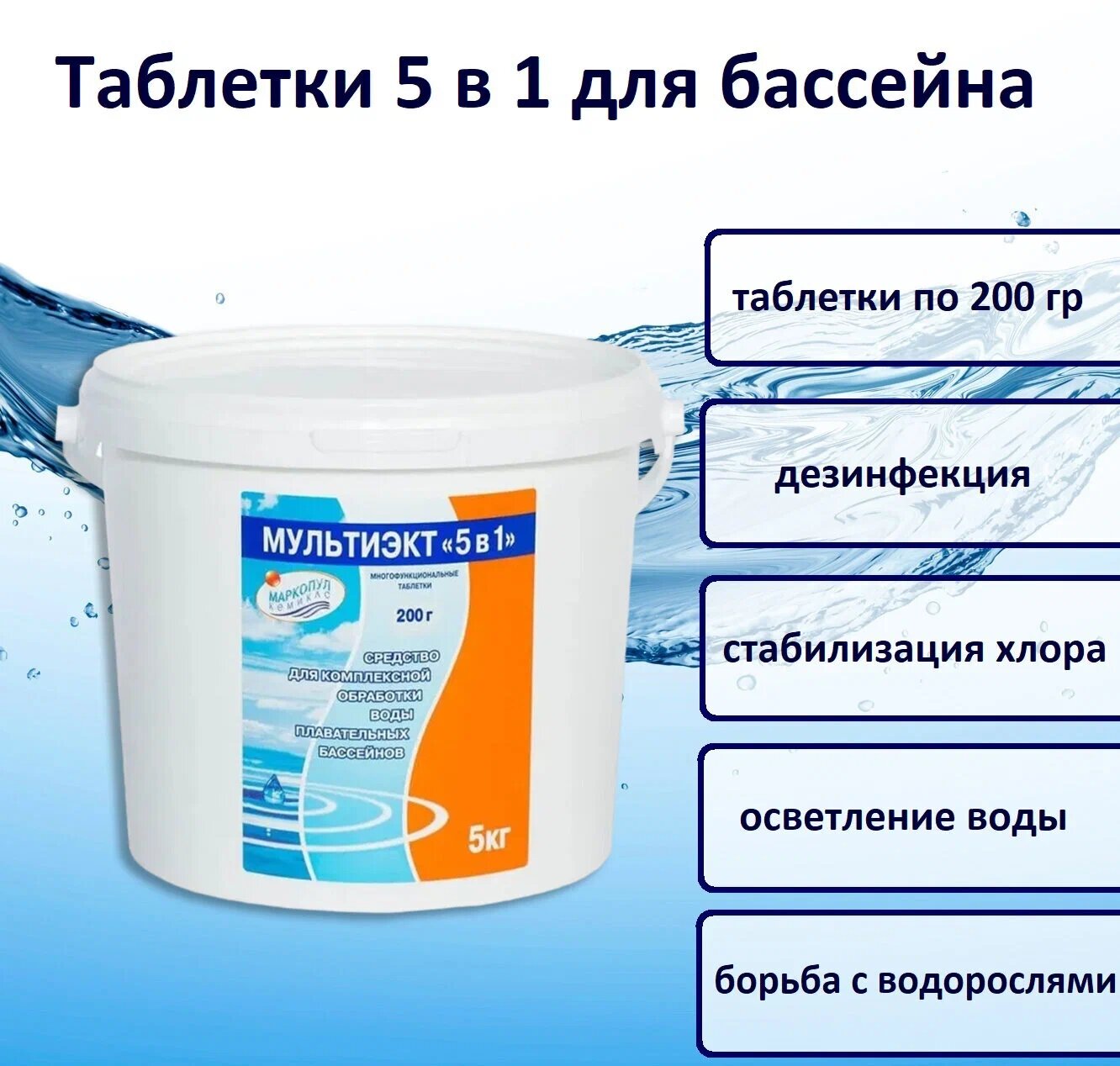 Маркопул Кемиклс Дезинфицирующее средство "Мультиэкт 5 в 1", для воды в бассейне, комплексный препарат, таблетки 200 г, 1 кг