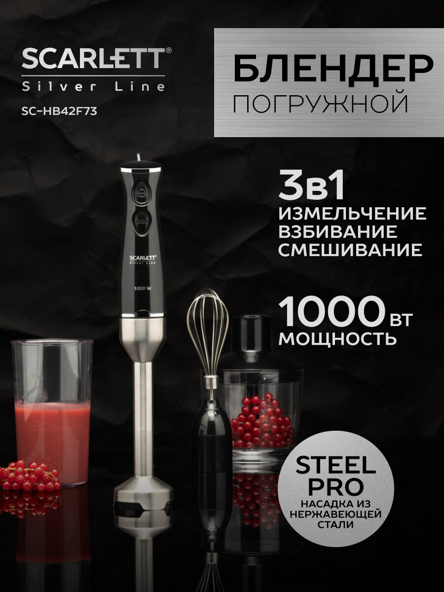 Блендер Scarlett SC-HB42F73 [1000 Вт, скоростей - 2, турборежим, измельчитель, стакан, венчик, черный, серебристый]