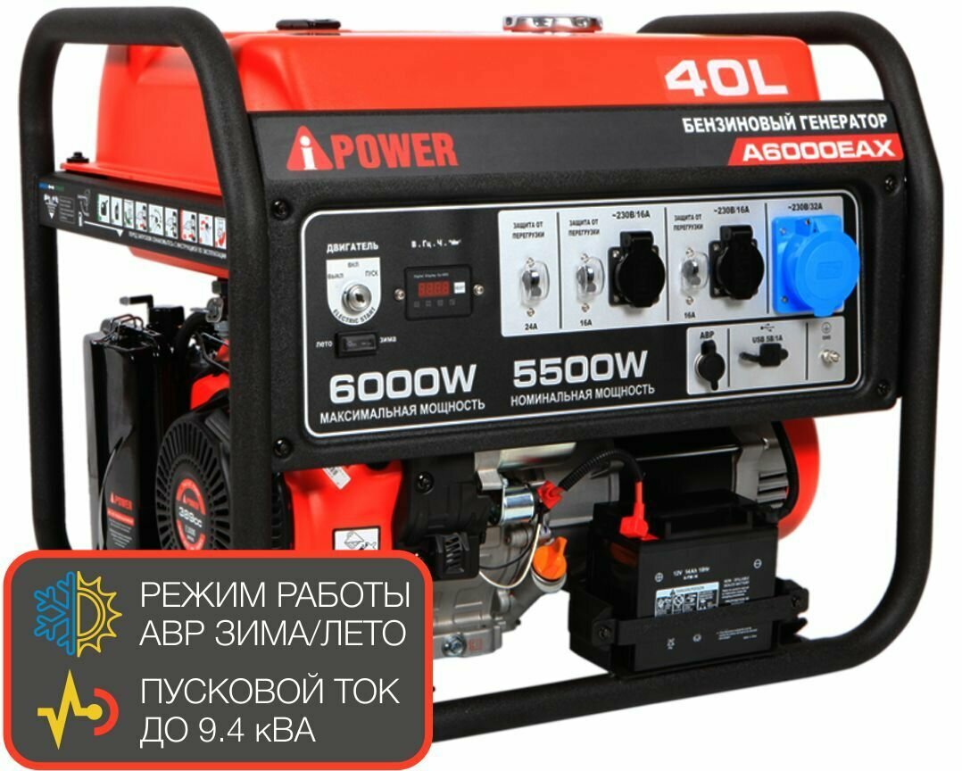 Генератор бензиновый портативный A- IPOWER A6000EAX 6кВт, пусковая мощность до 9,4кВA, 87,5кг