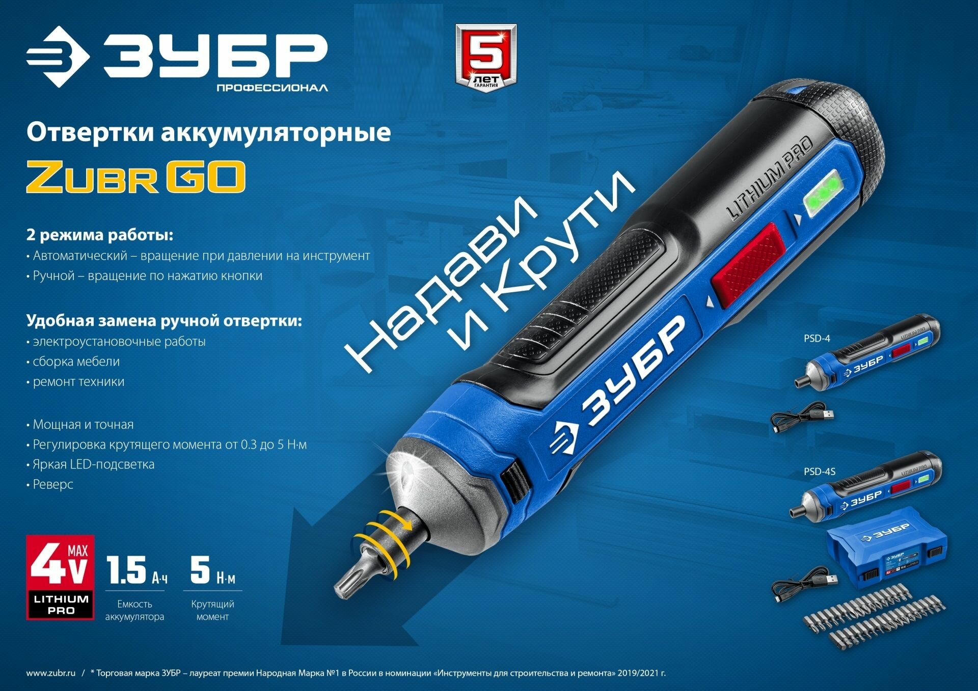 Аккумуляторная отвёртка 5Нм GO Зубр PSD-4S