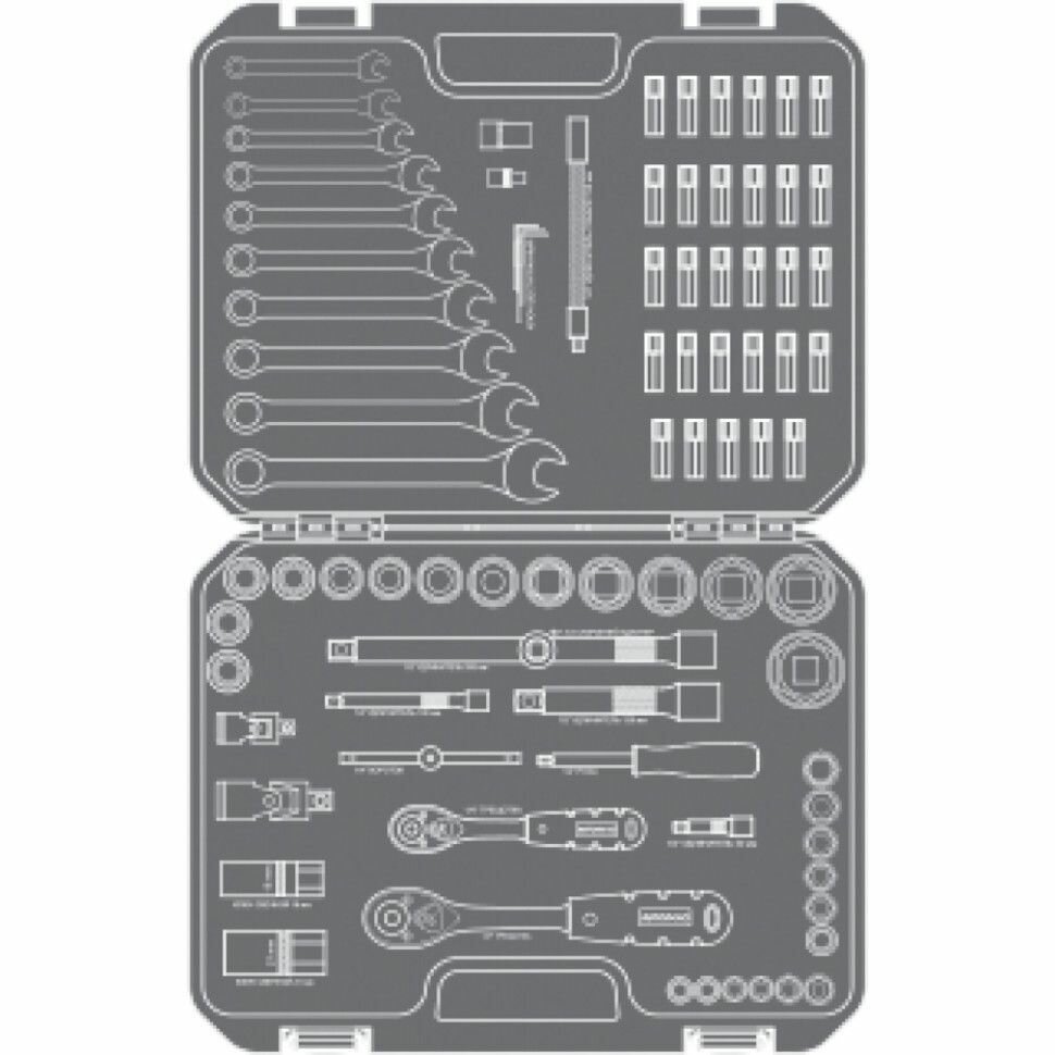 | Инструменты в комплекте | рукоять для бит / вороток для головок / трещотка / ключи гаечные / ключи имбусовые (шестигранные) |