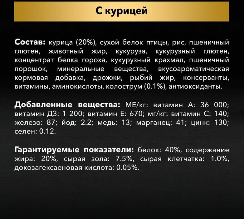 | Состав | курица (20%), сухой белок птицы, рис, пшеничный глютен, животный жир, кукуруза, кукурузный глютен, концентрат белка гороха, кукурузный крахмал, яичный порошок, минеральные вещества, вкусоароматическая кормовая добавка, дрожжи, рыбий жир, консерванты, витамины, аминокислоты, колострум (0.1%) |