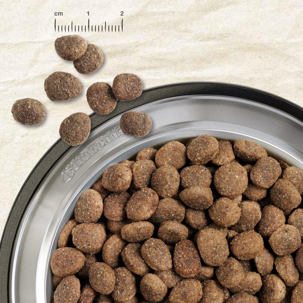 | Состав | свежее мясо птицы (30%); рис (17%); семена овса; белок домашней птицы, пониженной зольности, высушенный (12%); белок утки, высушенный (10%); мука сельди (5%); гидролизат печени птицы (5%); жир домашней птицы; растительные масла (пальмовое, кокосовое); мука из виноградной косточки (2,5%); пивные дрожжи, сушёные (2,5%); сухой жом, обессахаренный; цареградский стручок, высушенный; высушенное яйцо; cемена чии; дикальций фосфат; поваренная соль; калий хлористый; травы, сушёные (всего: 0,2%; листья крапивы, корень горечавки, золототысячник, ромашка, фенхель, тмин, омела, тысячелистник, листья ежевики); экстракт юкки |
