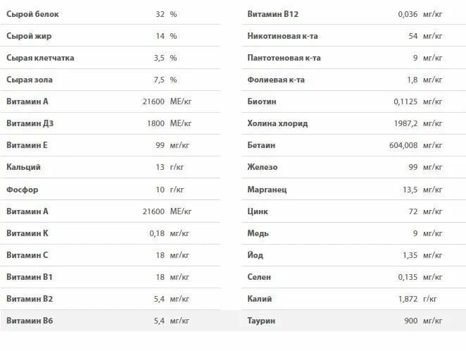 | Витамины | A, E, D3, K, C, B1, B2, B6, B12, никотиновая кислота, пантотеновая кислота, фолиевая кислота, биотин, бетаин, таурин |