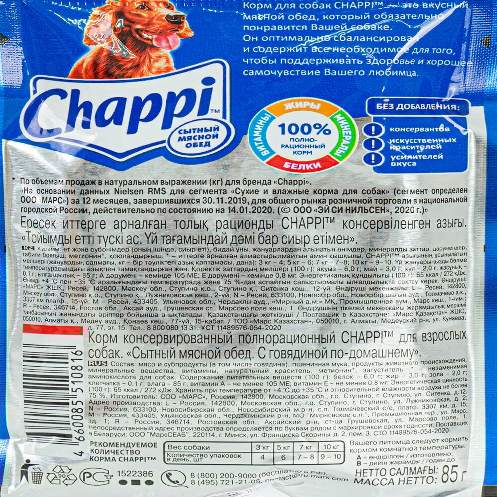 Chappi Влажный корм для собак Chappi Сытный мясной обед Говядина по-домашнему 85г 10222863 0,085 кг 43484 (2 шт)