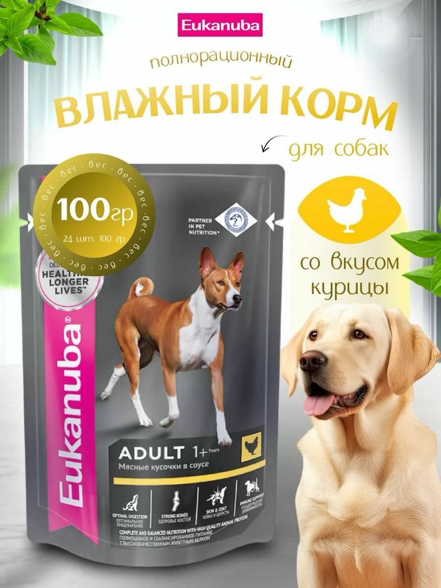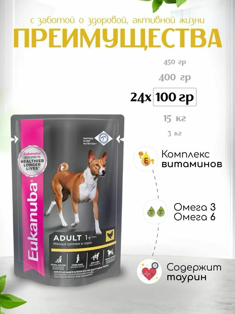 Корм влажный (паучи) Eukanuba Adult Dog для взрослых собак с кусочками курицы в соусе, 100 г х 24 шт