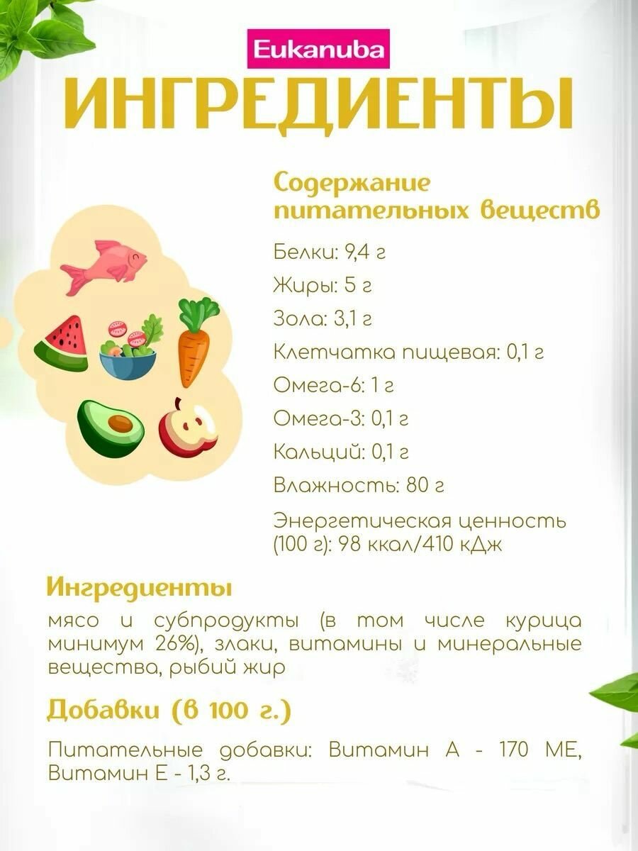 Ниже Вы можете прочитать отзывы на Корм для собак Eukanuba Adult All Breed влажный рацион из курицы в соусе, 24х100г, ознакомится с подробными характеристиками, посмотреть интересные обзоры и фотографии на Корм для собак Eukanuba Adult All Breed влажный рацион из курицы в соусе, 24х100г.