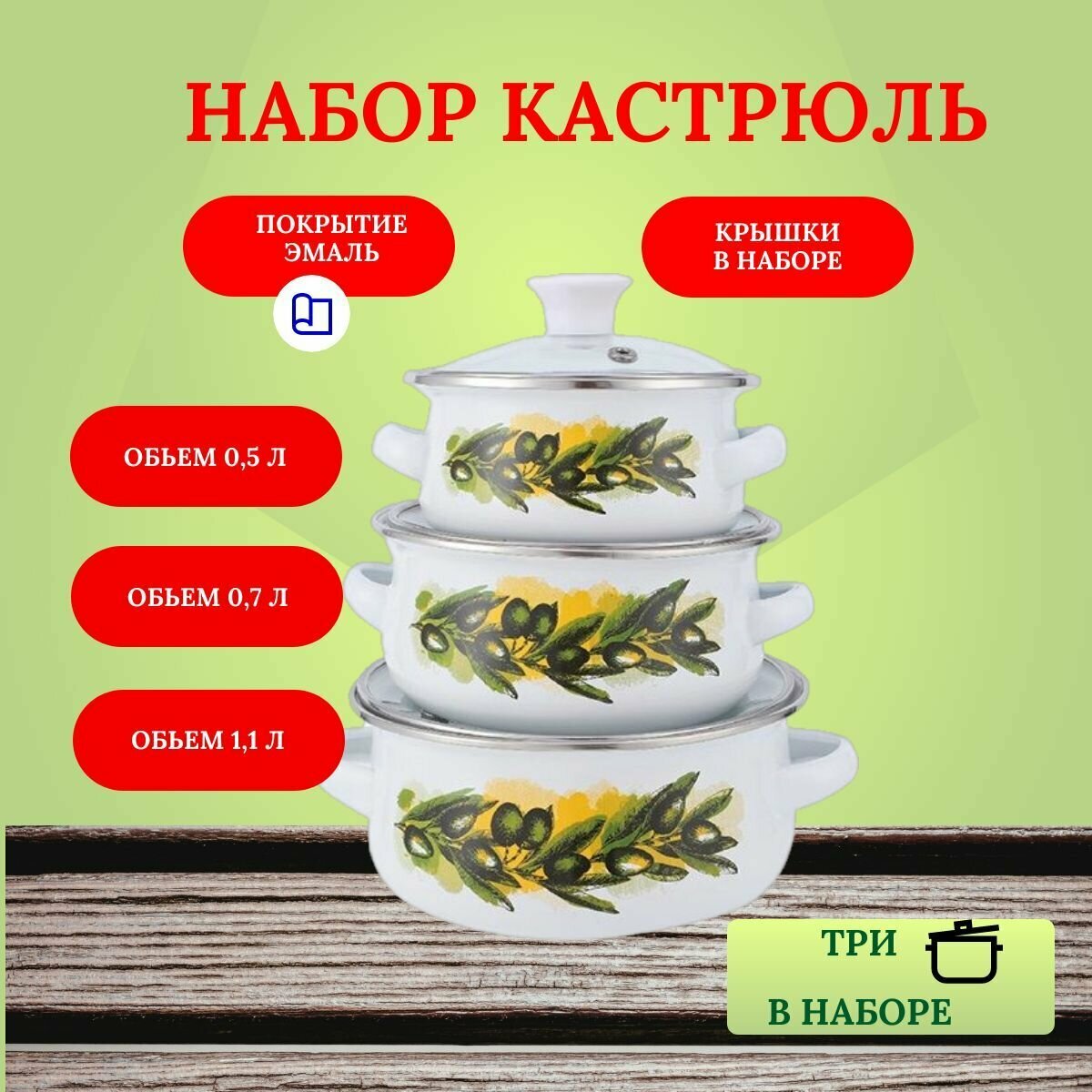 | Комплектация | кастрюли: 0.5 л, 0.7 л, 1.1 л; 3 крышки |