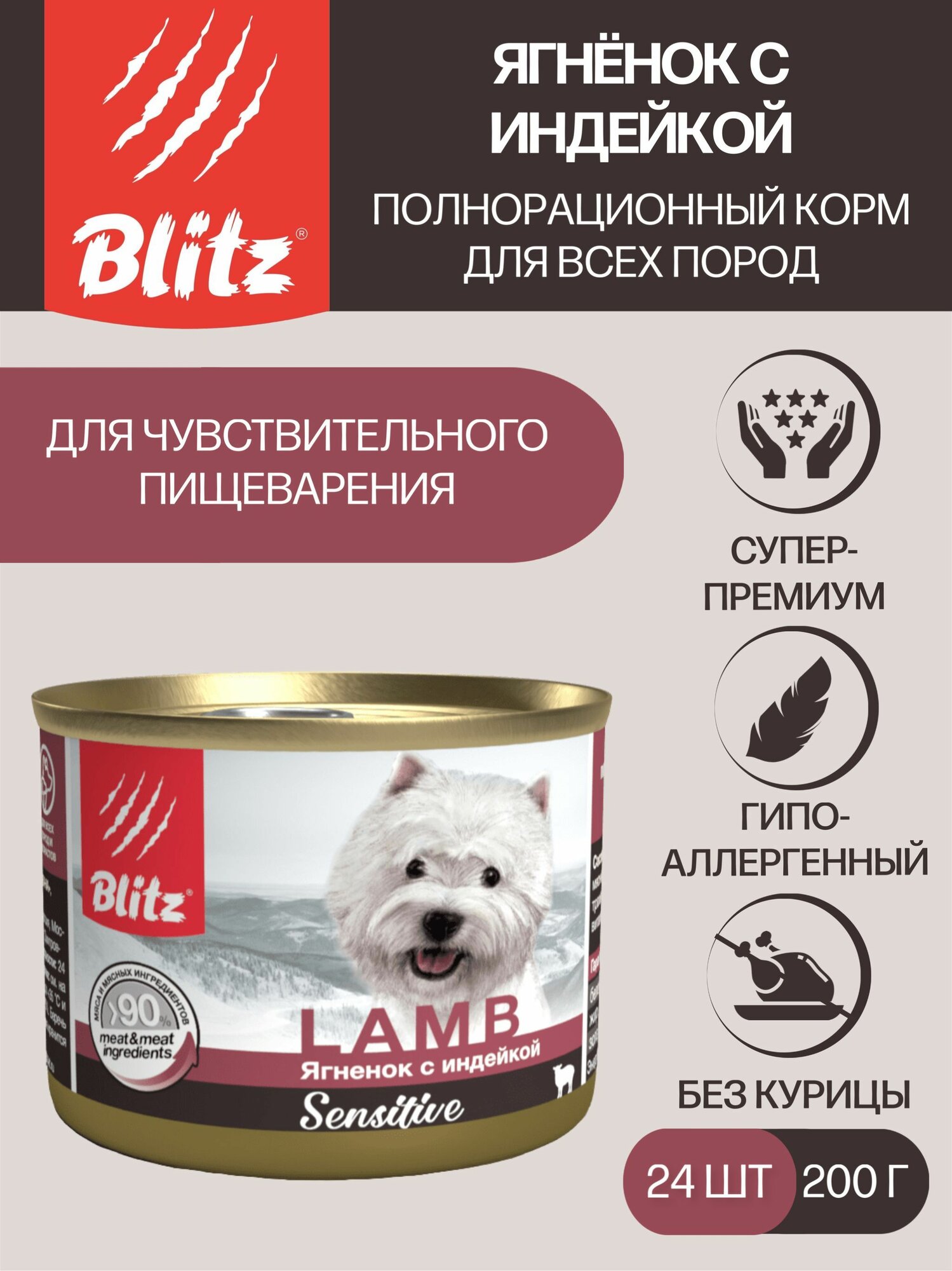 BLITZ SENSITIVE для собак и щенков с чувствительным пищеварением с ягненком и индейкой (200 гр х 24 шт)