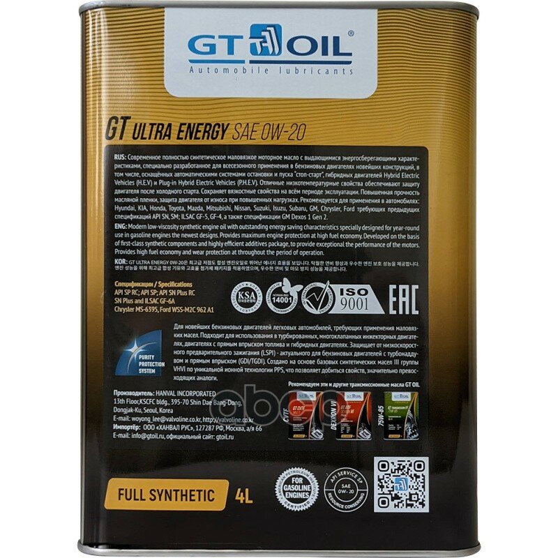 Масло моторное gt oil gt ultra energy 0w-20 api sp/gf-6a синтетическое 4 л 8809059408902
