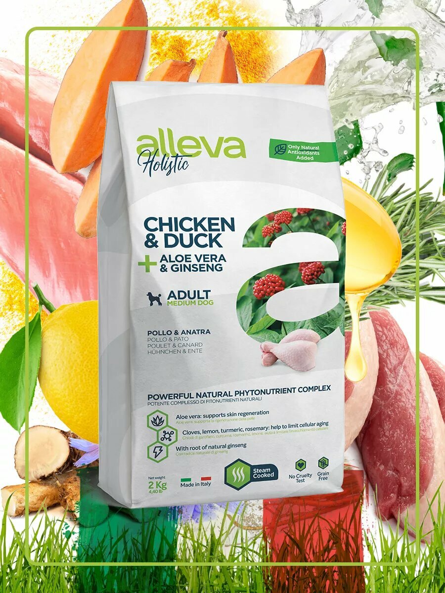 Сухой корм Alleva Holistic MEDIUM для взрослых собак средних пород, с курицей и уткой, алое вера и женьшенем, 2 кг