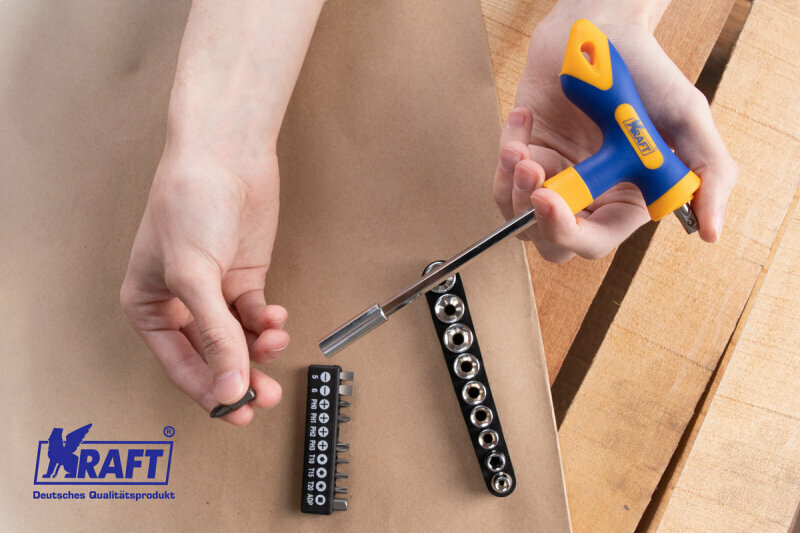 KRAFT KT701039 Набор: Т-образная отвертка с насадками-битами и торцевыми головками 20 предметов