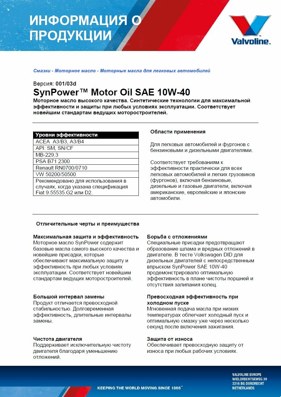 Valvoline Valvoline^872260 Масло Моторное Valvoline Synpower 10w40 4л.