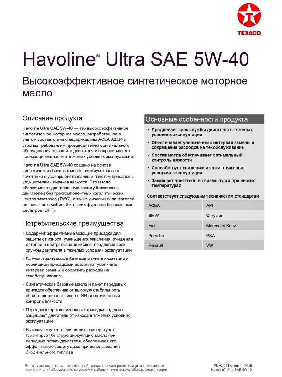 Синтетическое моторное масло TEXACO Havoline Ultra 5W-40, 1 л