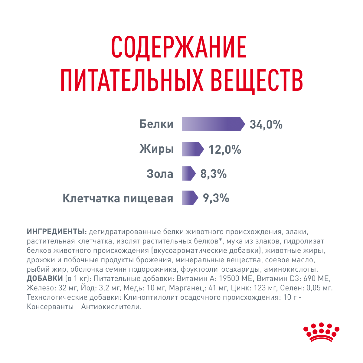 | Состав | дегидратированные белки животного происхождения (птица), злаки, растительная клетчатка, изолят растительных белков, мука из зерновых культур, гидролизат белков животного происхождения (вкусоароматические добавки), животные жиры, дрожжи и побочные продукты брожения, минеральные вещества, рисовый крахмал, соевое масло, рыбий жир, оболочка и семена подорожника, фруктоолигосахариды |