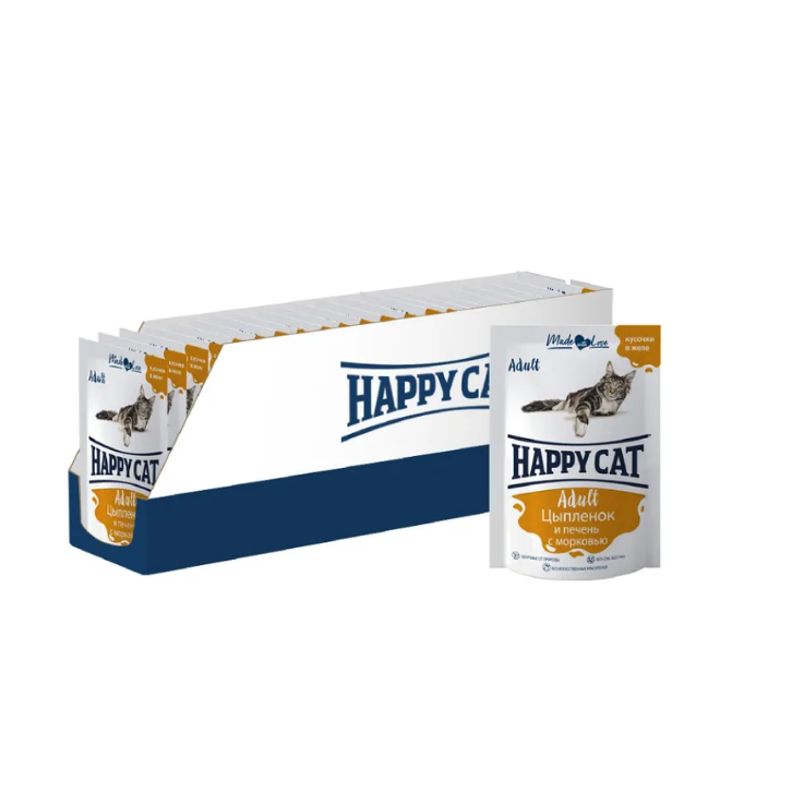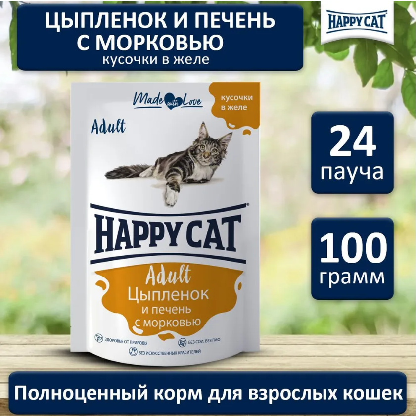 Купить Happy Cat паучи для взрослых кошек с цыпленком, печенью и морковью в желе - 100 г х 24 шт (Россия)