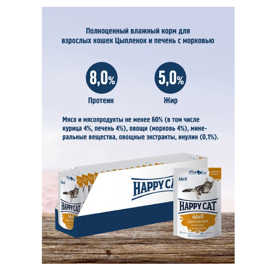 HAPPY CAT для взрослых кошек с цыпленком, печенью и морковью в желе 7502308 (100 гр х 24 шт)
