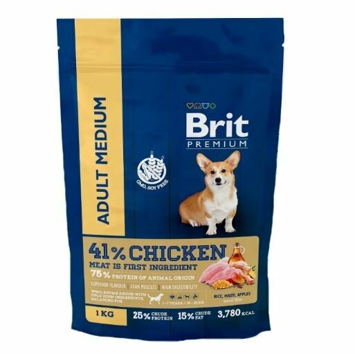 Купить Сухой корм Brit для собак средних пород 10-25кг курица premium dog adult medium 1кг 5049943