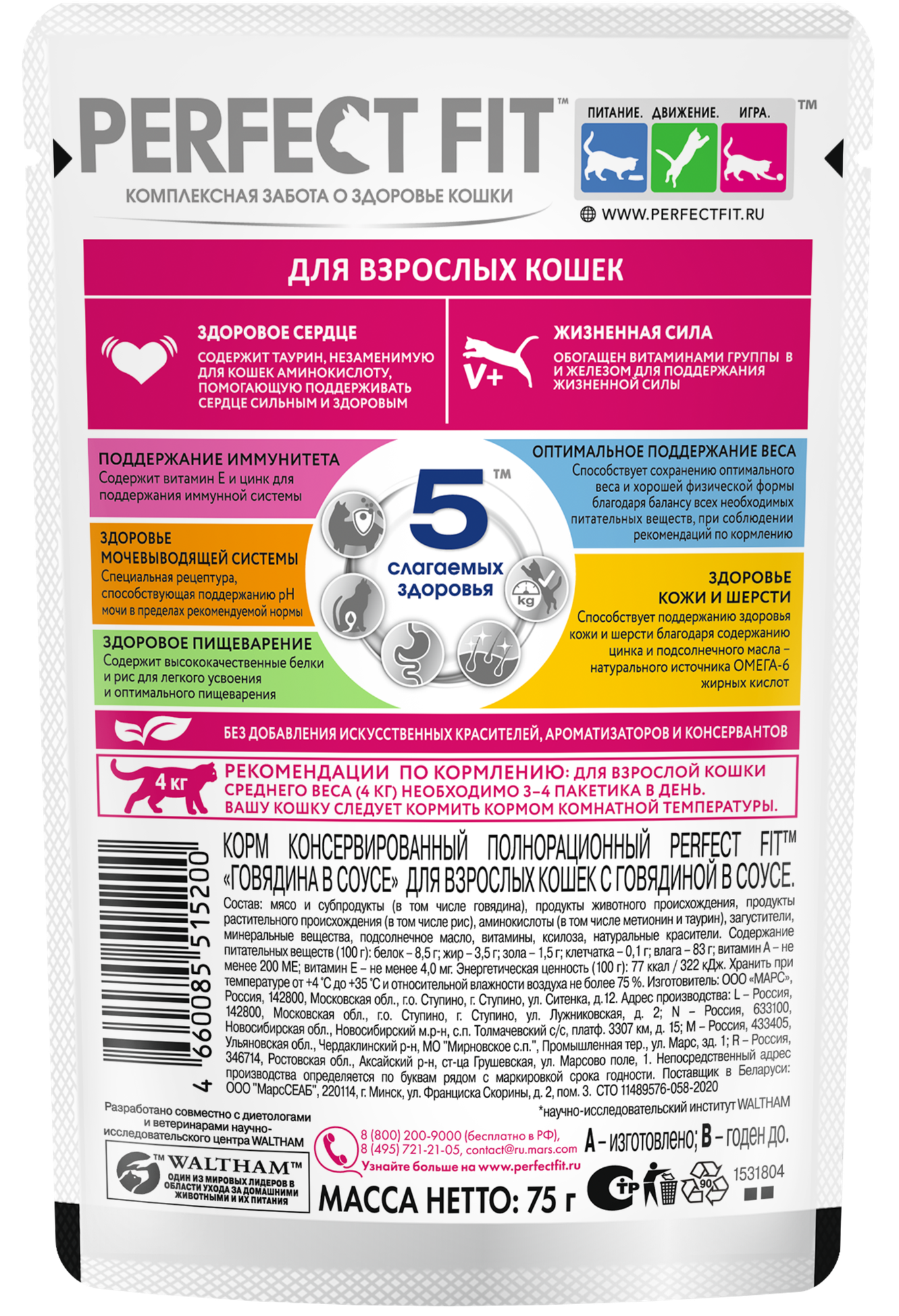 Влажный корм для кошек PERFECT FIT говядина в соусе, 75 г, 28 шт