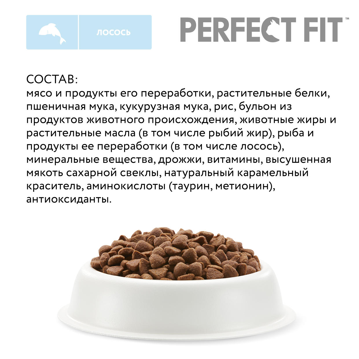 | Состав | мука животного происхождения (в том числе из лосося), пшеничная мука, кукурузная мука, концентрат кукурузного белка, рис, концентрат соевого белка, животные жиры и растительные масла (в том числе рыбий жир), бульон из продуктов животного происхождения, концентрат пшеничного белка, минеральные вещества, пивоваренные дрожжи, высушенная мякоть сахарной свеклы, витамины, аминокислоты (таурин, метионин), натуральный карамельный краситель, антиоксиданты |