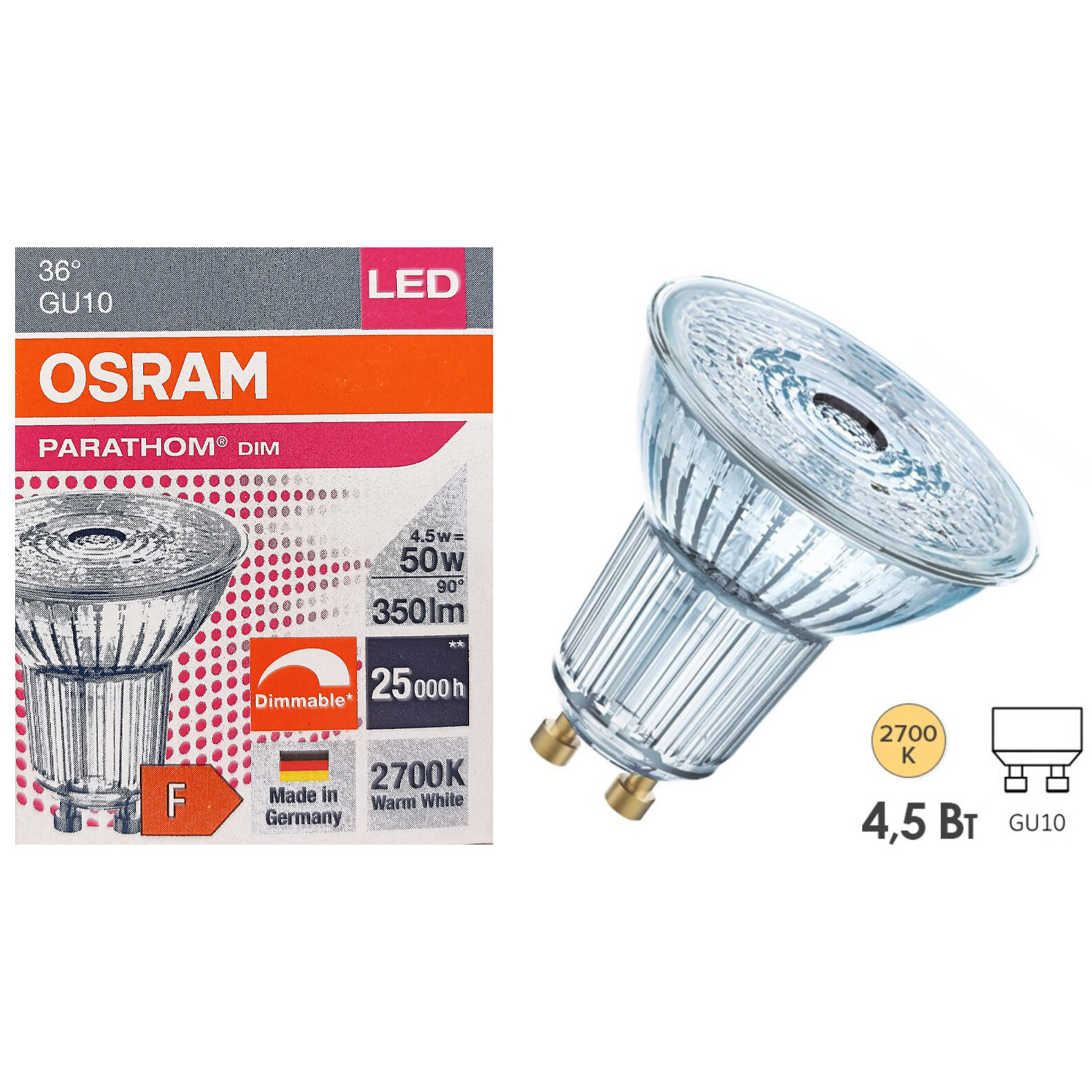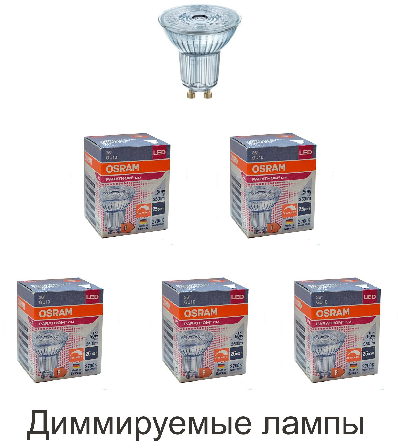 5 шт/уп. Лампа LED Софит 4.5W 220-240V GU10 PAR16 350Лм 2700К Угол 36 град. D-51mm L-54mm Диммируемая Свет Теплый белый OSRAM, уп. 5шт