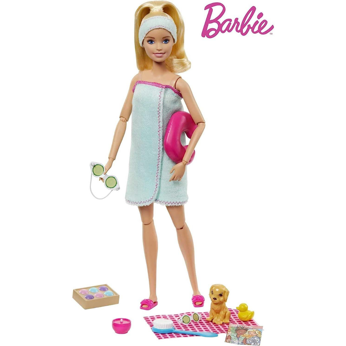 Кукла Barbie GJG55 Wellness Spa, блондинка, со щенком и 9 аксессуарами, включая подушку для шеи, резиновую уточку и маску для глаз в виде огурца, игрушка в подарок для детей от 3 до 7 лет