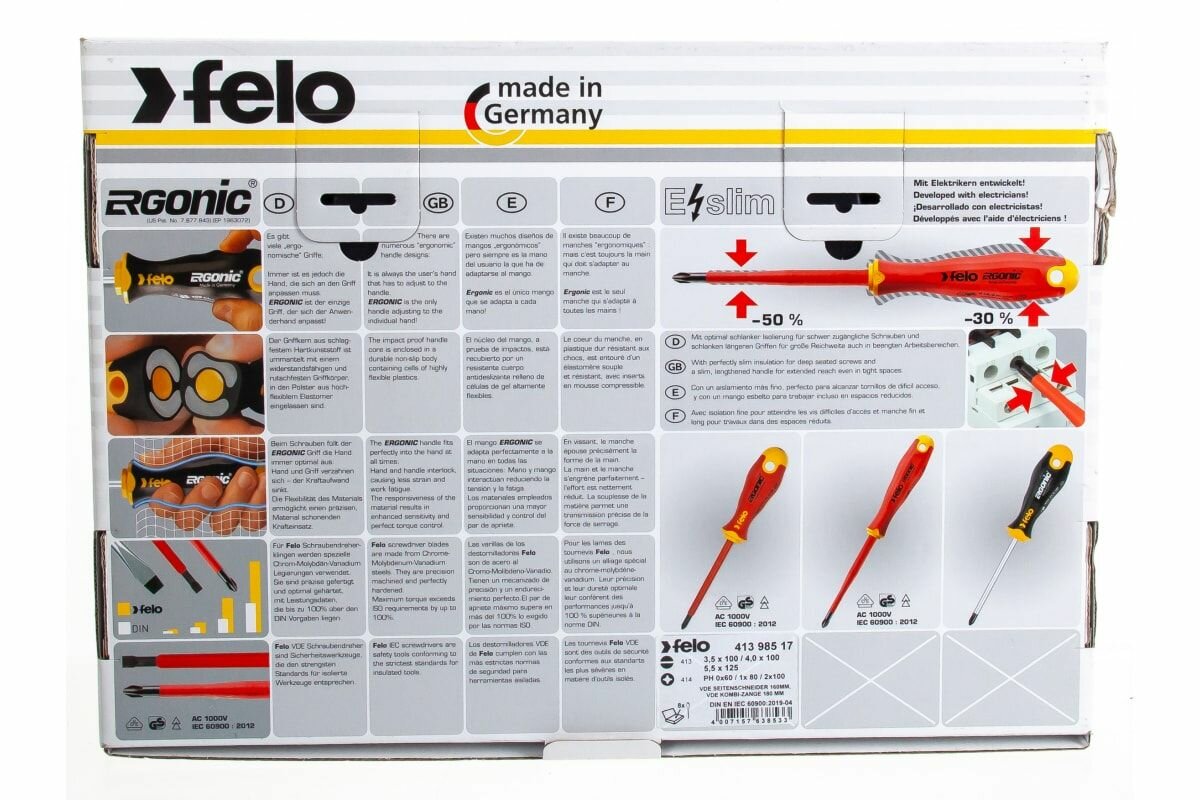 Набор диэлектрических отверток Felo 41398517, Ergonic с диэлектрическими пасатижами и бокорезами в упаковке, 8 шт