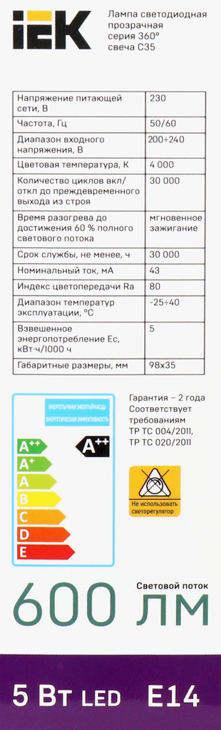 Ниже Вы можете прочитать отзывы на Лампа IEK LED свеча 5Вт, 230В, 4000К, цоколь Е14 360, Арт. LLF-C35-5-230-40-E14-CL, ознакомится с подробными характеристиками, посмотреть интересные обзоры и фотографии на Лампа IEK LED свеча 5Вт, 230В, 4000К, цоколь Е14 360, Арт. LLF-C35-5-230-40-E14-CL.