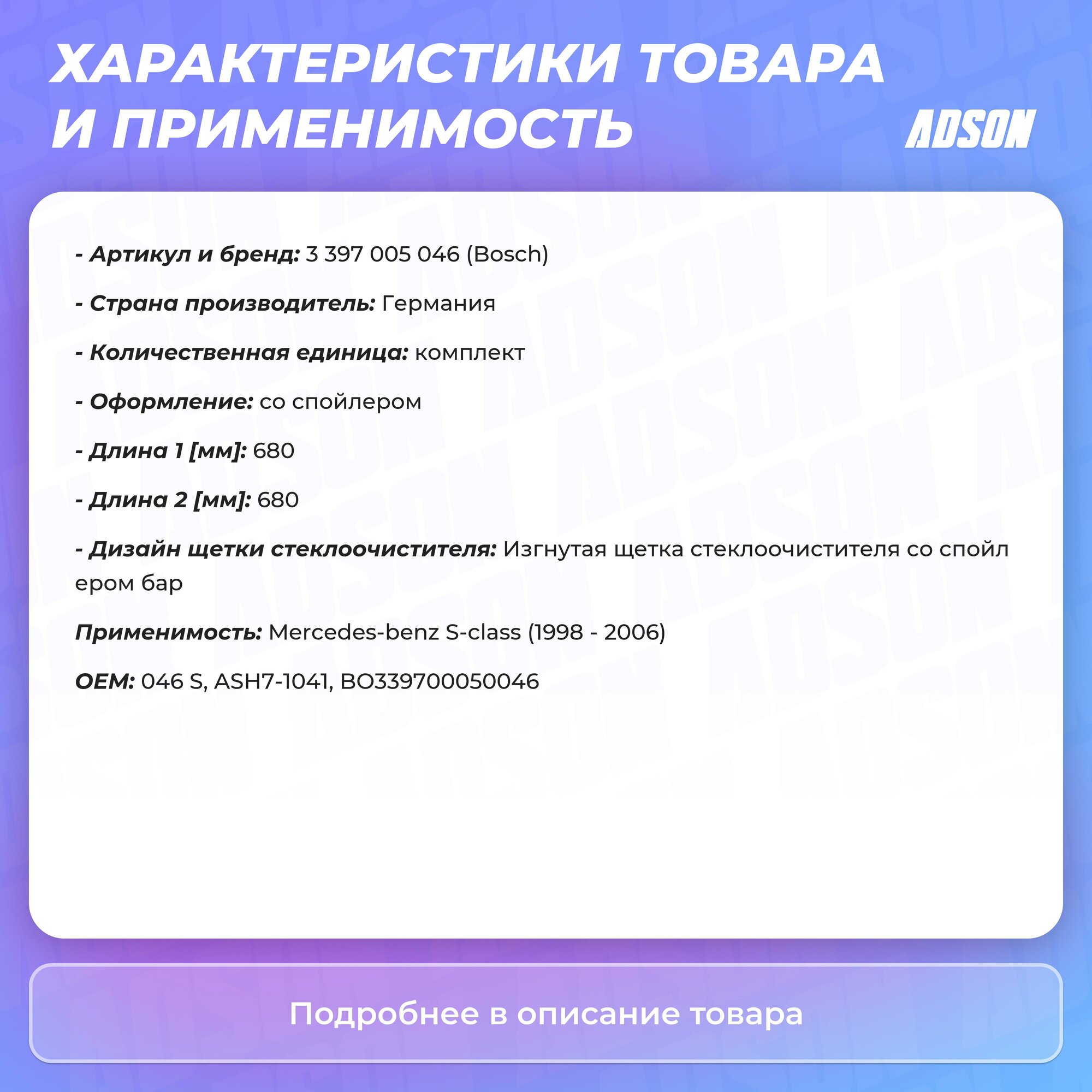 Щетки стеклоочистителя MERCEDES-BENZ: S-CLASS S 280 /S 320 /S 320 CDI /S 400 CDI /S 430 /S 500 /S 600 98-05, S-CLASS купе CL 500 /CL 55 AMG /CL 600 9 BOSCH 3397005046