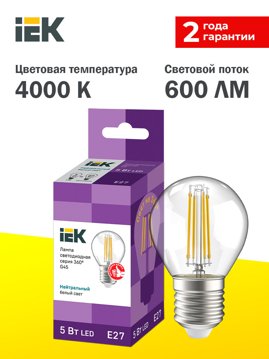 Светодиодная лампа IEK G45 5Вт 230В 4000К E27 филамент.